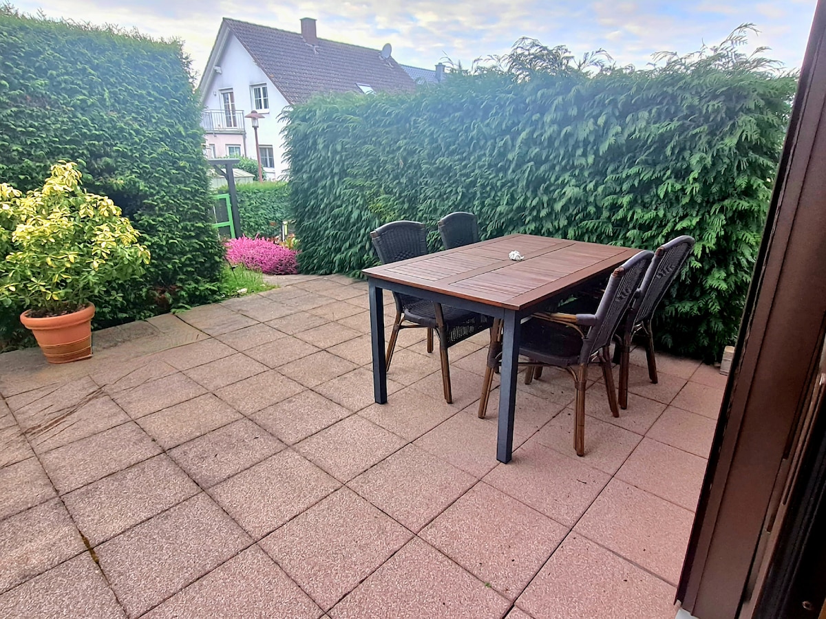 The bright and friendly apartment with living room and bedroom is located on the garden level of our house, which is accessed by an external staircase. Very good bus connection to downtown. In the neighborhood there is a café, an ice cream parlor, two pizzerias and lots of shopping (10-minute walk) and lots of greenery. The property is located in a quiet residential area. Free parking is available on the property or right in front of the house or on the main road, 100 meters from the house.