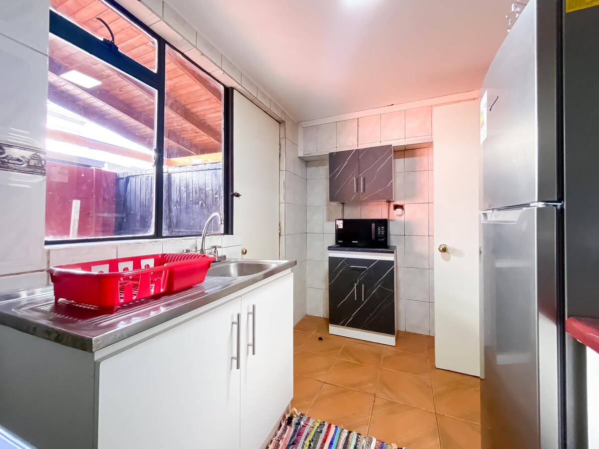 Enjoy the simplicity of this quiet and central accommodation, fully equipped, spacious, ideal for resting or working, less than a block from supermarkets (Unimarc, Santa Isabel and Tottus), Los Andes clinic, school, strip center. It has a swimming pool, gazebo, terrace, sports areas, etc. Very comfortable and cozy. Condominium with 24/7 guard. It has a terrace on the balcony to enjoy the sunset. With protection. Includes sheets and towels for each guest.