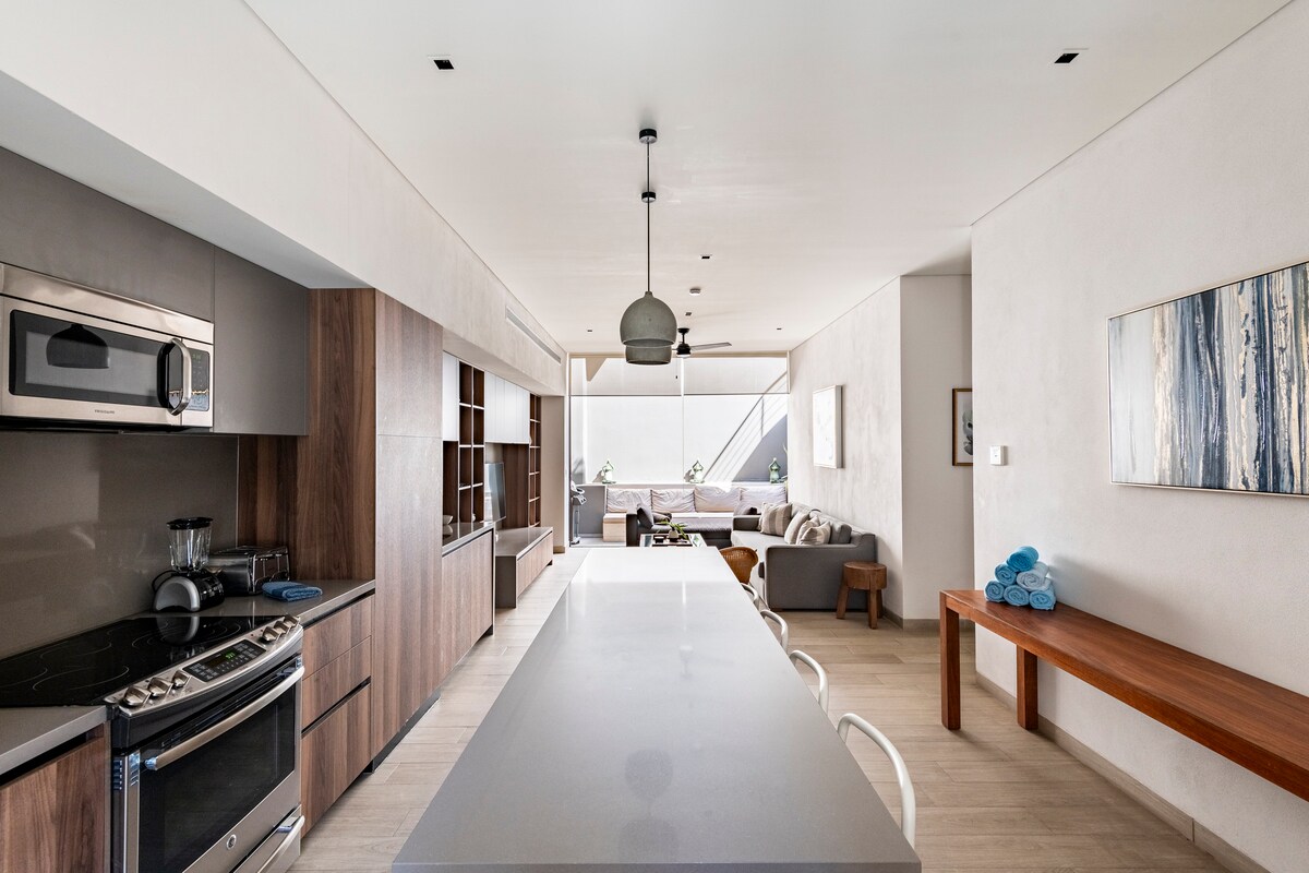 A peaceful and family-friendly home for up to 6 people with plenty of space and limited pool access. The central location makes logistics very simple. There are plenty of restaurants & bars (CaboWabo, La Dolce), shops, and weekly markets (Org. Market on Sat, Art Walk on Fri), no more than 5 min walking. The beach, Medano, and popular mall, Puerto Paraiso, are both 10-15 min walk away. Pool access is limited to the hours 9am-6pm. There is a grill available with outdoor dining and a back balcony.