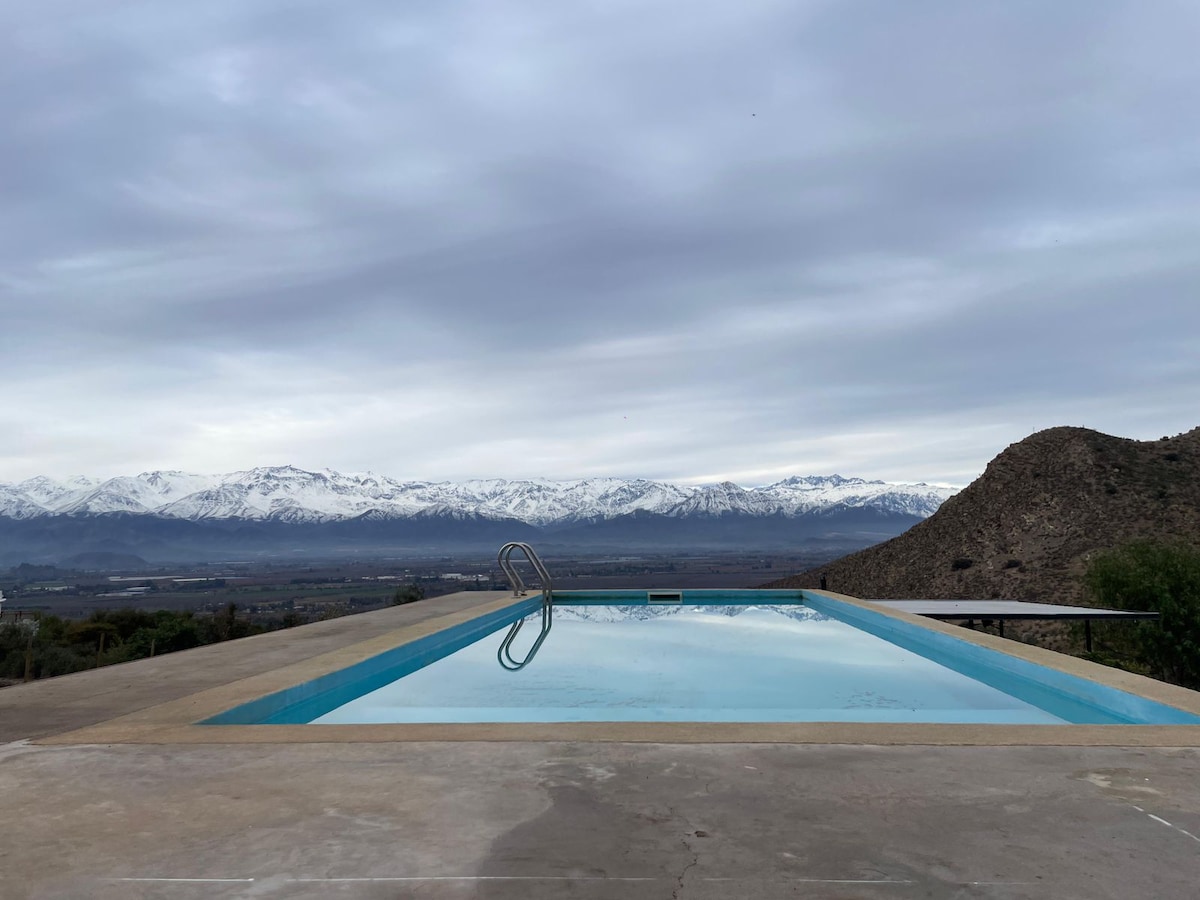Refugio privado y exclusivo con vista privilegiada a la Cordillera de los Andes. Ubicado en total silencio y rodeado de naturaleza, sin casas cercanas. Cuenta con piscina de nado y tinaja (Hot Tub de uso exclusivo de la cabaña), gran quincho y espacios totalmente equipados. Aire Acondicionado WIFI incluido, puedes hacer teletrabajo desde la piscina. Ideal para Adultos Joven. Sustentable, cómodo y pensado para desconectar. A 20 mi del Casino Enjoy, 60 mi de Portillo y 1 hora de Santiago.