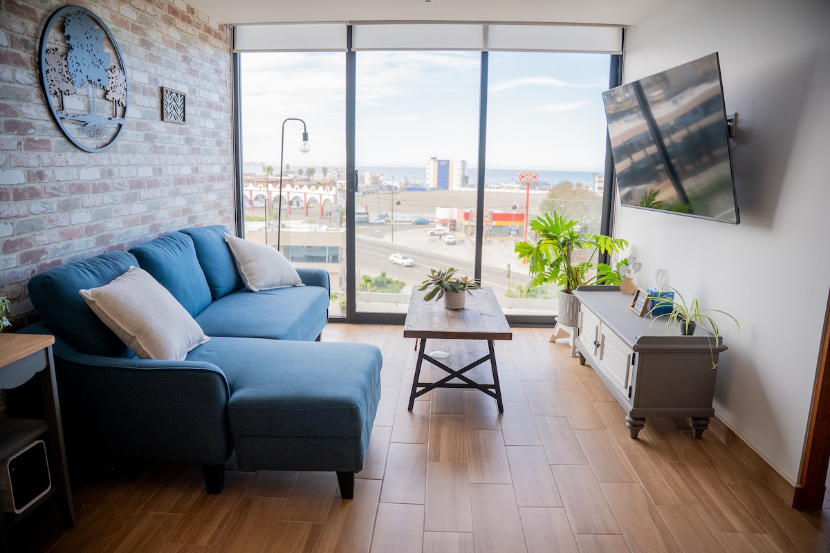 Este increíble y moderno loft, ubicado en Playas de Tijuana, es ideal para disfrutar un descanso en pareja y de hermosos atardeceres y vistas del océano. A solo 20 minutos de la frontera con EE.UU. Este Loft cuenta con: -Habitación principal con cama Cal King. -Baño completo -Sala de televisión con smart TV, con acceso a una cuenta de Netflix. -Cocina equipada -Balcón para disfrutar al aire libre. -Edificio con seguridad 24/7 -Estacionamiento para 2 vehículos.
