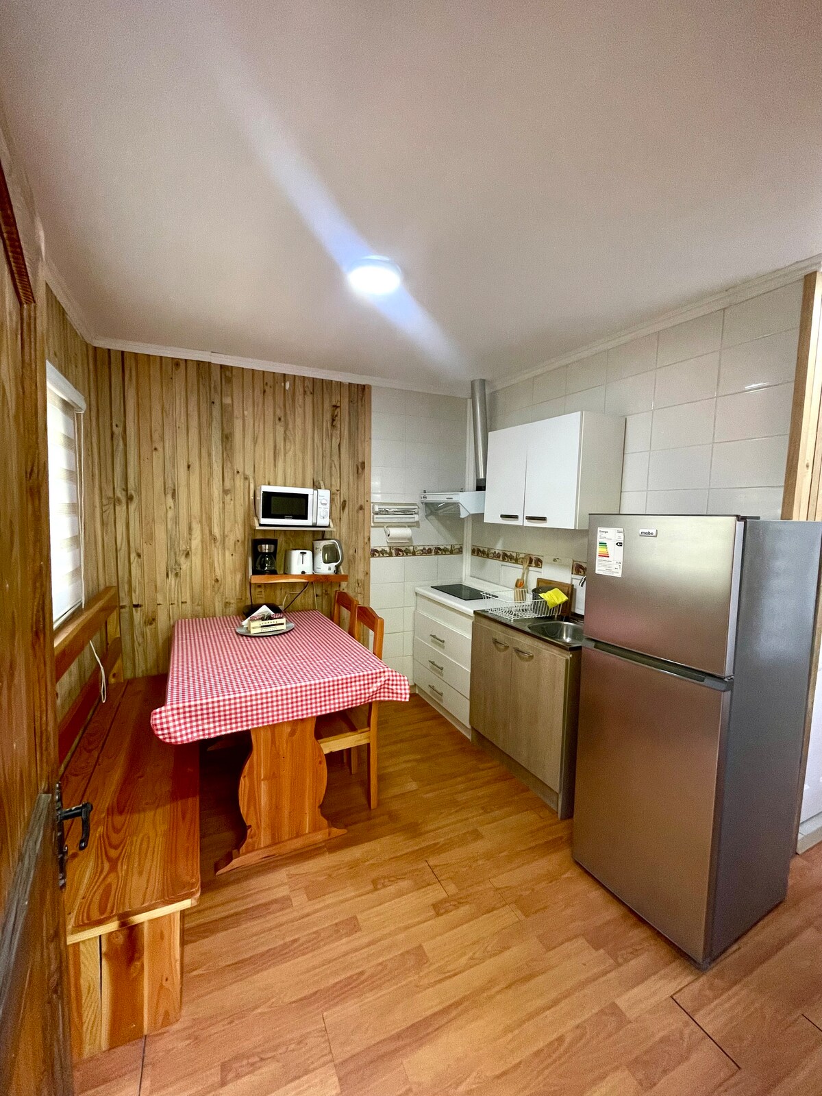 Only 10 minutes from Huilo Huilo and other tourist attractions. Fully equipped cabin for 4 people with Wi-Fi connection The dining room has a microwave, blender, full set of dishes, utensils and TV with wifi. In addition, a barbecue and common areas, shared with the other guests. Indoor pool (not heated) Private tinaja and sauna on the shore of the estuary (additional service, book 1 day in advance). Includes sheets and towels. Minimum stay: 2 nights Heating is with a wood-burning stove