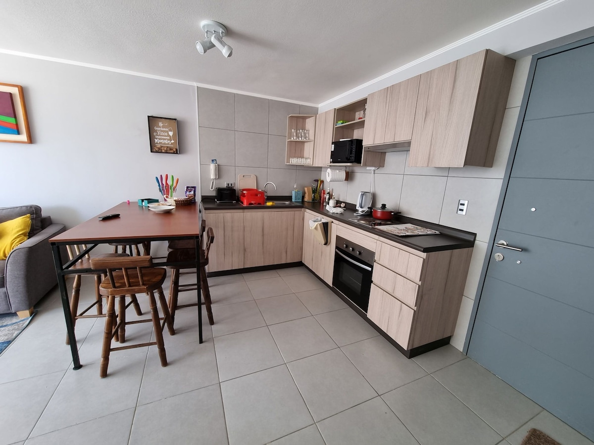 Seaside apartment, ideal for walking, swimming, diving, surfing. Close to restaurants, pubs, supermarkets, craft fairs. Ideal for forgetting about driving. Close to Puquen National Park. It has a swimming pool, jacuzzi, children's games, taca-tacas, and Quinchos next to the pool area. It has a gas grill, enclosed terrace, and terrace furniture