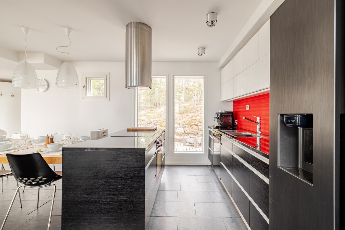 Uusi ja ylellinen mökki Porvoon saaristossa meren rannalla. Lattiaan asti ulottuvat ikkunat tuovat upeat luonto- ja merimaisemat olohuoneeseen ja makuuhuoneisiin. Oma puulämmitteinen rantasauna omalla yksityisellä rannalla tarjoaa unohtumattoman elämyksen meren äärellä, ja omalta laiturilta voit uida ympäri vuoden (säävaraus). Moderni skandinaavinen sisustus, lattialämmitys ja laadukas keittiö tekevät oleskelusta täydellisen – paikka rauhoittumiseen ja nautiskeluun.