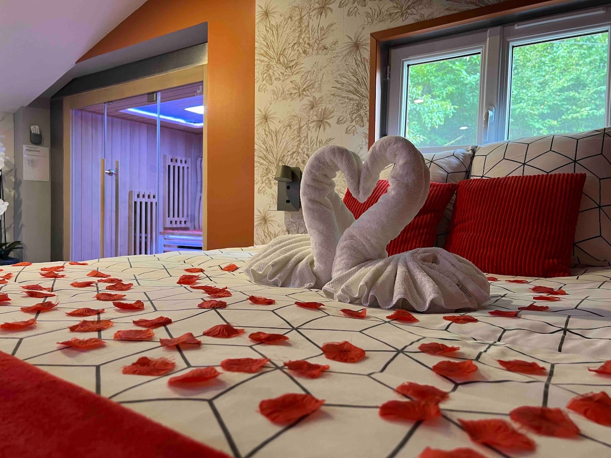 Chalet SPA Privatif de 50 m2 , jardin 1300 m2 - Cuisine aménagé entièrement équipée ( Petit déjeuner inclus à votre arrivé uniquement - pose de pétales de roses inclus sauf inscription personnalisée -Suite parentale avec Sauna/Balnéothérapie -Double douches à l'Italienne Salon avec cheminée - Lit 160x200 /TV/Wifi/Netflix -Serviettes de bain/Peignoirs/chaussons jetable et linge de lit OPTIONS : 1/2 bouteille de champagne...29,00 € Lait de velours divers senteurs pour balnéo 9,00€