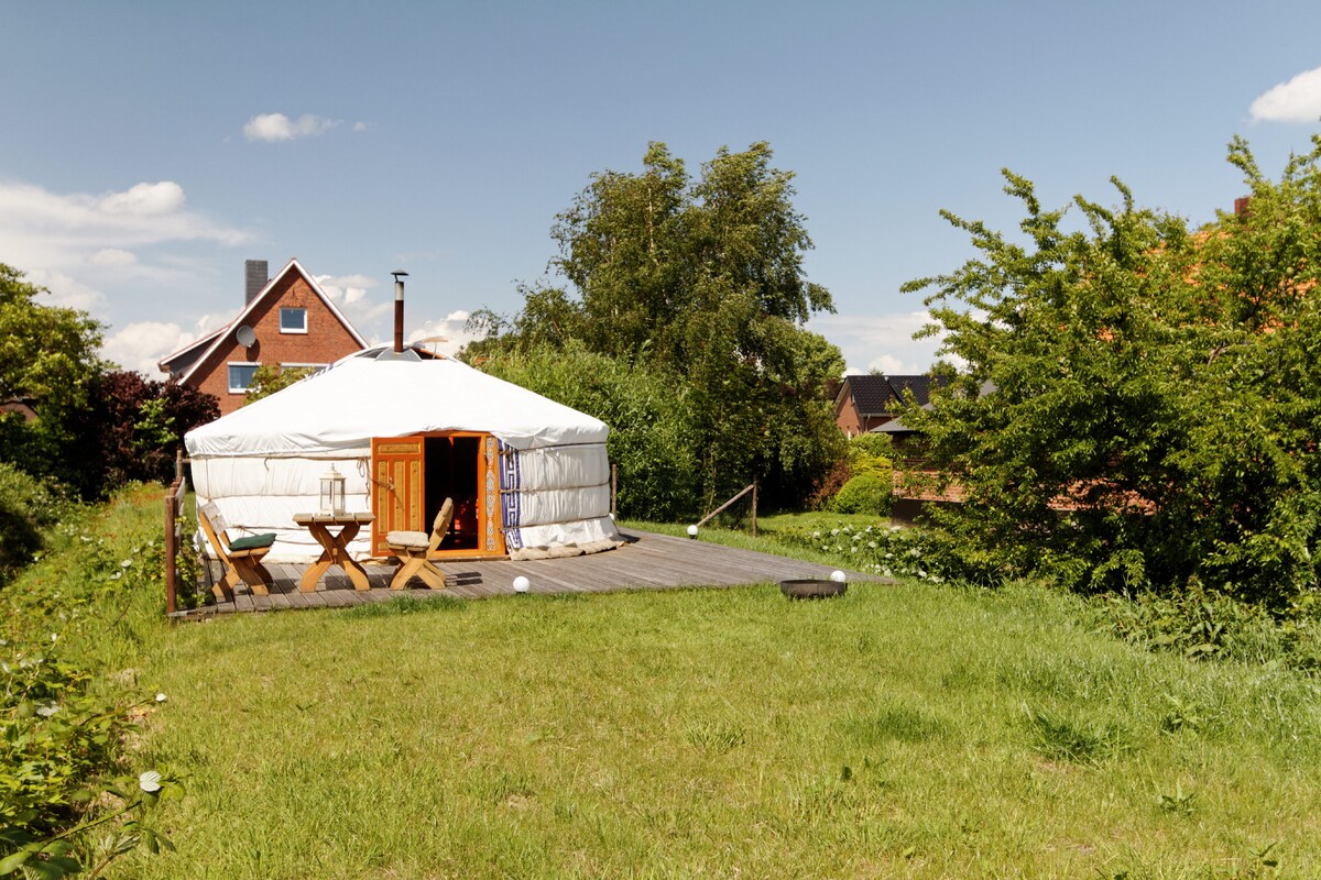 Glamping in our rustic Mongolian yurt. Equipped with a cozy 1.80m bed, grill and outdoor seating, electricity, and heating, it offers a unique getaway in nature. The separate bathroom with a shower is just a few steps away. Priwall Beach 20 min., Lübeck 15 min., supermarket 2 min. Perfect for nature lovers who want to combine comfort and tradition. Sauna available for a fee of €10 per day.