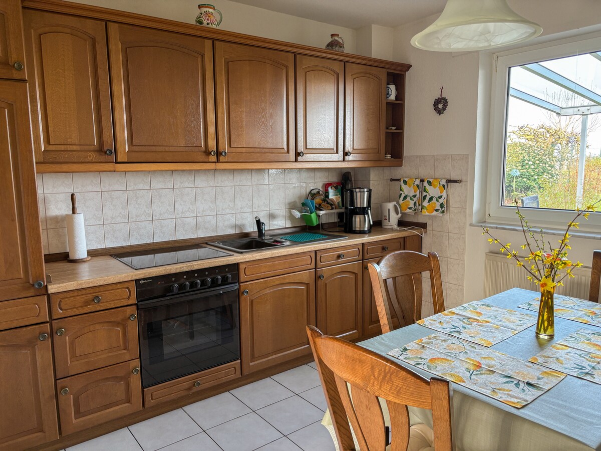 Ideal for families and excursions to Phantasialand or Cologne. Our spacious apartment is idyllically located on a hill on the outskirts of the village with fantastic views over Brühl to Cologne Cathedral. The fully equipped kitchen offers a stove, oven, coffee maker and kettle. Meals can be enjoyed indoors or on the two terraces – often with a sunset view. Bicycles can be safely stored, an electric grill can be rented. Washer and dryer are available on request.