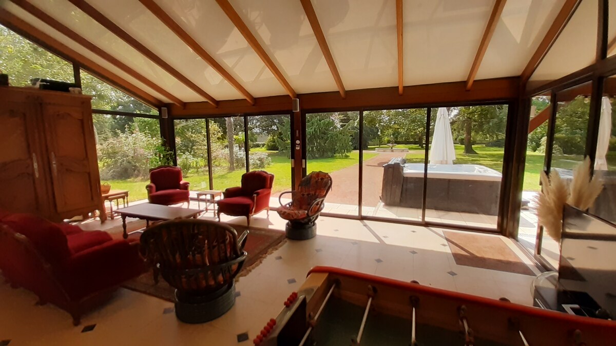 In the heart of a quiet, wooded park, this charming 92 m2 air-conditioned cottage essentially includes a large living room with a small bar open to a dining room and integrated kitchen; all on one level overlooking the park and a large terrace with SPA, sauna, fireplace and garden furniture. In the park: swing, trampoline and pétanque court. Under a courtyard in the park: ping pong table, love seat, swing, hammock. Water basin, squirrels, and hawks enhance the whole.
