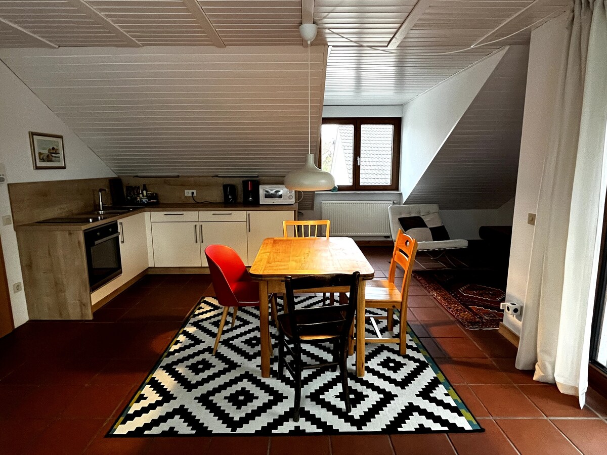 Fall asleep under the stars 🌌 In our cozy studio you can relax ideally and look at the stars in the large bed under the skylight. There is a well-equipped kitchen and a dining area. On the south-facing balcony overlooking the countryside you can forget the time and enjoy the tranquility. Home office is also no problem thanks to broadband Internet.