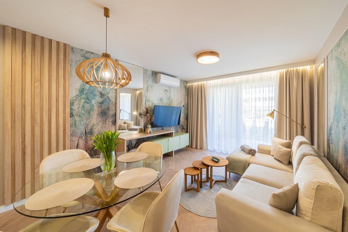Sauna - Jacuzzi/Whirlpool - Massage Chair - 2 x 75-inch TVs - 1 x 65-inch TV - WIFI - Netflix - Ice Maker - Safe - Fully Equipped Kitchen - Polish TV Our 70 m² apartment is located directly on the promenade in Dziwnów and can accommodate up to 4 people. It is 150 meters to the sea and 100 meters to the newly built Dziwnów harbor. In the immediate vicinity, there is a modern playground and a well-maintained park with various outdoor sports equipment.