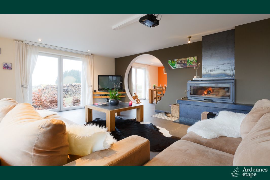 Price includes made-up beds, bath and sauna towels. No extra charges for water or electricity. Check-in and check-out are flexible, depending on bookings. Enjoy complete relaxation in a stylish and luxurious retreat in the heart of the Ardennes, located in a quiet residential area. Unwind in the spacious sauna, soak in the hot tub, or relax by the cozy wood fire under the covered terrace. Perfect for unwinding, recharging, and enjoying comfort, nature, peace, and total privacy.