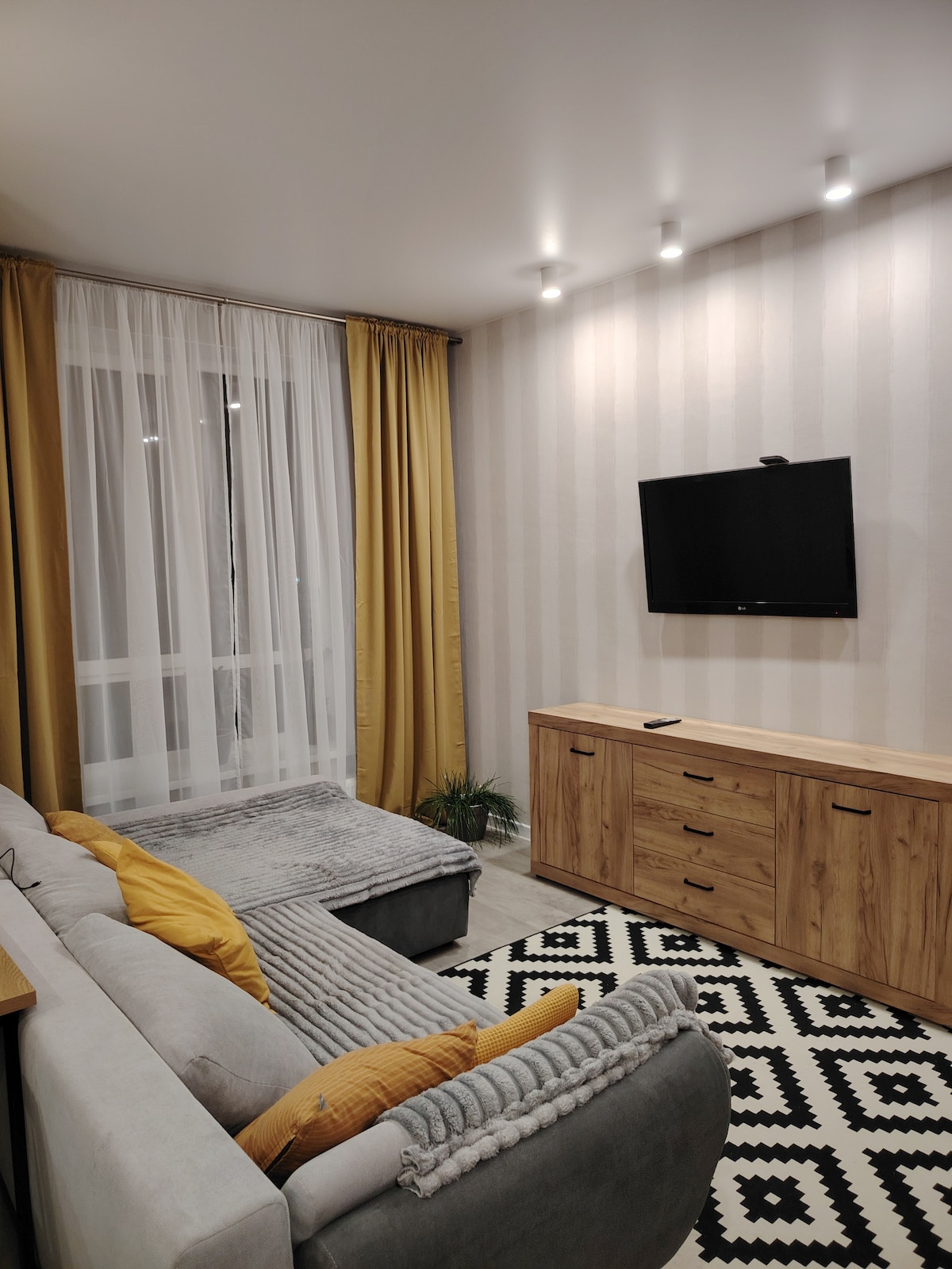 Stylish design, fresh renovation and modern materials create a pleasant atmosphere. The bedroom is equipped with a bed with an orthopedic mattress for a comfortable sleep. The living room has a sofa bed for two, a TV and a large storage closet. The apartment is fully equipped with everything you need: a modern kitchen with household appliances, a spacious dining area. The bathroom has a rain shower and a washing machine. First time rental. Located in a new residential complex, close to the sea.