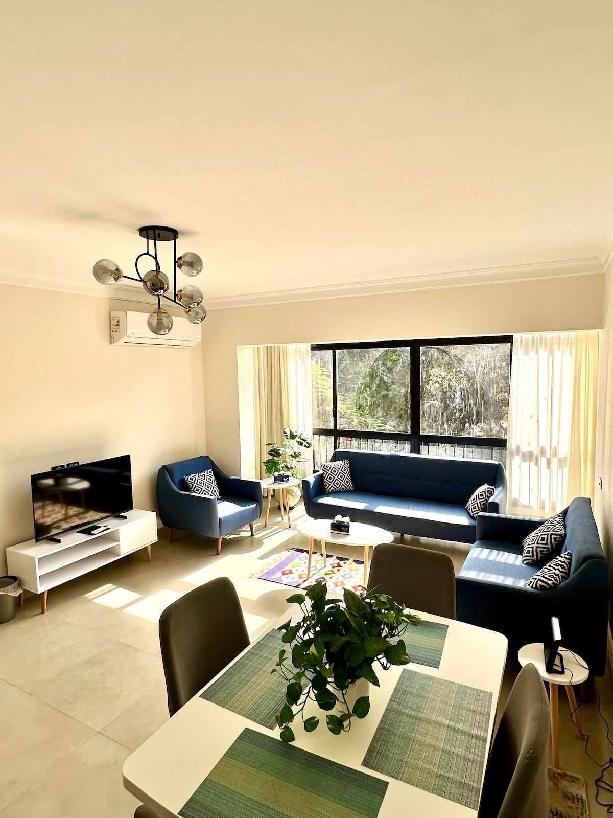 Welcome to our cozy Boho-style apartment in a peaceful, upscale neighborhood! Enjoy a bright space with lush plants, parquet floors, and a fully equipped kitchen. Relax with a 65-inch Smart TV and take in the beautiful garden view. Just a 3-minute walk to local shops and 20 minutes to downtown and the Egyptian Museum, it's the perfect retreat where comfort meets convenience!