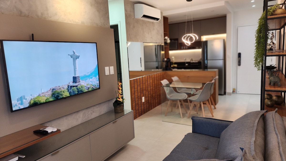 Have fun with your family at this stylish and comfortable place. Located in Ponta Verde, Maceió, one of the best neighborhoods in the city, 150 meters from the beach, close to the main tourist attractions. New apartment, with 2 bedrooms, 1 of which is a suite. Comfortably accommodates up to 6 people. Parking for 1 car. There is air-conditioning in the two bedrooms and living room. Fully equipped kitchen with utensils and appliances. Panoramic swimming pool overlooking the sea. No smoking.
