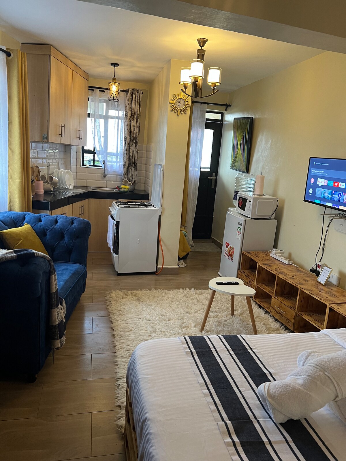 Karibu to your bright open-layout cozy studio apartment perfect for layovers or long stays. Just 8.7km from JKIA, 3.9km from SGR, 3.3km to the Expressway linking to Westlands 19km away (toll charges apply), and 1.8km to Gateway Mall. It's safe to check-in even late in the night with 24/7 security, elevator and keypad access. Features fast Wi-Fi, backup generator, queen bed, workspace, modern kitchen, free gym and pool access and complimentary housekeeping. Enjoy our Kenyan coffee and tea.