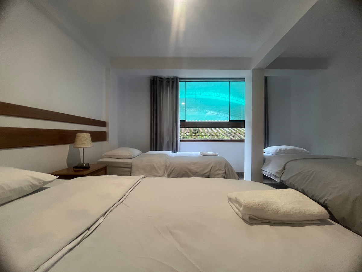 Habitación con tres camas. Te esperamos en Machupicchu Pueblo a 4 minutos caminando de la estación de tren y al frente de la estación de bus que te llevará al Santuario de Machupicchu.