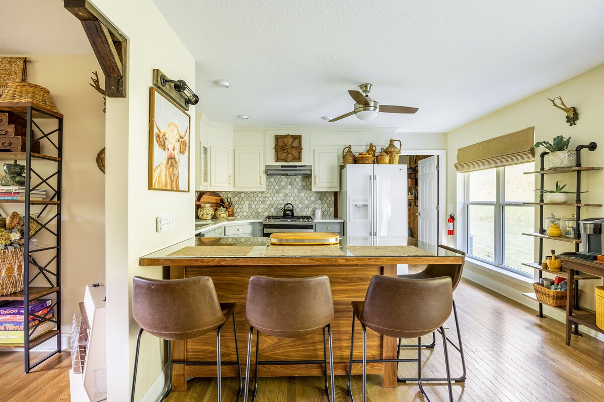 Beautiful Mid-Century Modern, Strong Wi-Fi Family Farmhouse with Panoramic Valley, Mountain and Sunset Views. Farmhouse boasts a fireplace, 2 large living areas, 3 bedrooms, 2 baths, sleeps 6. Easy 3 mile paved drive to Main Street, Franklin. Many wonderful cultural, outdoor activities in Historic Franklin; hub to Asheville, Highlands, Scaly Mountain, Nantahala, Cherokee, Western Carolina University. After a busy day of adventure, enjoy a beautiful Mountain Sunset and a sky full of stars.