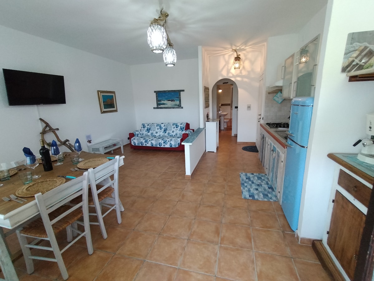 Three-room apartment with 1 double bedroom, 1 bedroom with two single beds and a sofa bed in the living room, sleeping a total of 6 people. Recently renovated and furnished. 300 meters on foot from the sea, located in the quiet and characteristic "Il Borgo" Residence in Porto Pollo where children can walk around safely and from which you can easily access the sea even without a car.
