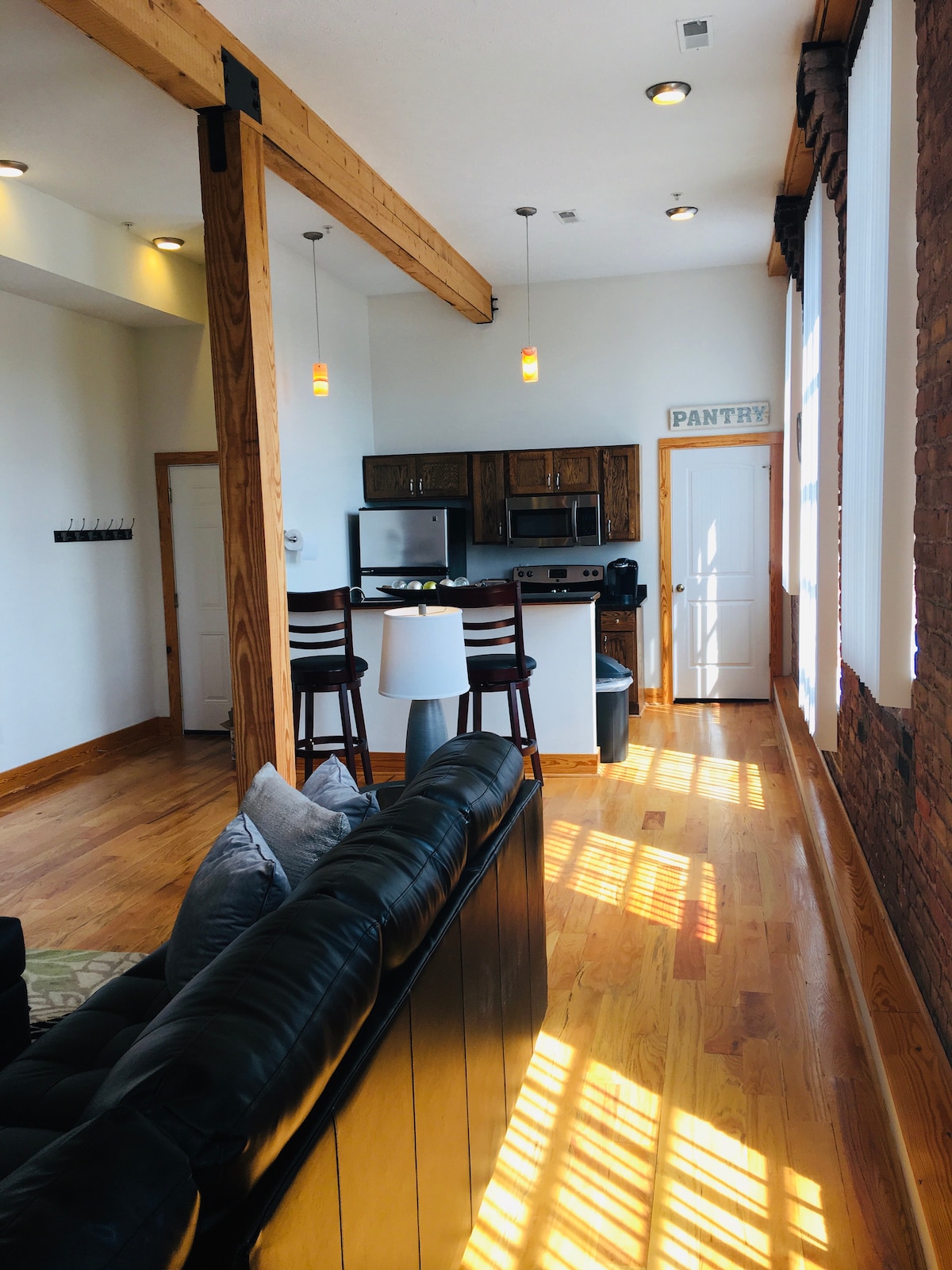 Main Office Lofts are located in a renovated commercial building in the heart of Downtown Lynchburg Virginia. The Panel downtown Loft has character & modern amenities in 850sf of space. Very comfortable queen bed, full bathroom, kitchen with microwave, fridge, stove and dishwasher, comfortable queen sleeper couch, and more The bedroom is separated from the living room by the panel wall This unit comfortably sleeps 2-4 people Accessible by one flight of stairs No smoking in Loft or Building