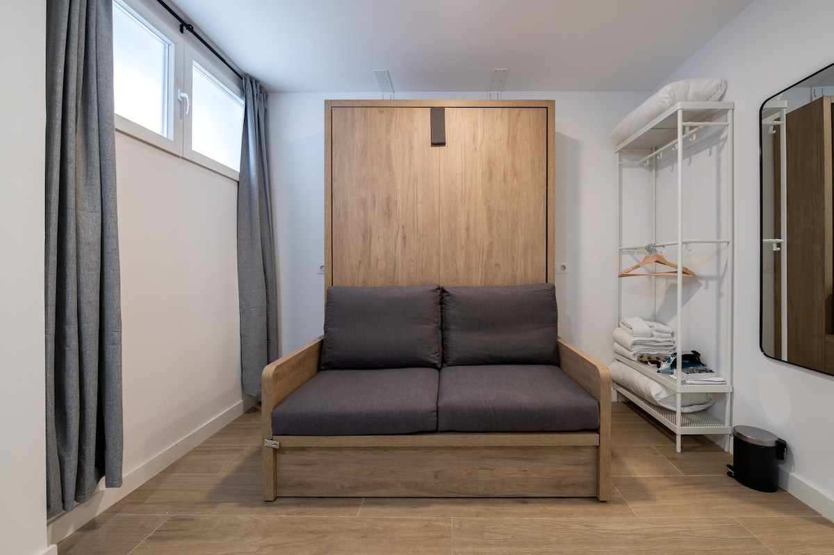 Private room in Madrid, ideal for up to 2 guests. This 15 m² space features a double Murphy bed that converts into a sofa, allowing you to enjoy both a comfortable sleeping area and a seating space. It also includes a private bathroom. The room is fully equipped with TV, Wi-Fi, air conditioning, hair dryer, and an iron. A mini fridge, coffee maker, kettle, and essential tableware are also provided.