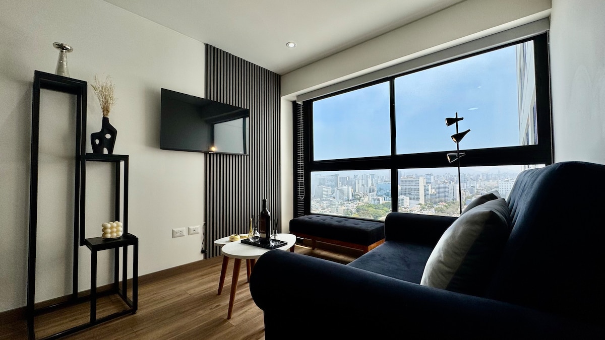 In exclusive San Isidro, this apartment places you steps from the pier to enjoy oceanfront sunsets and paragliding. Surrounded by Lima's best award-winning restaurants, you'll be in a safe, central area just 5 minutes from Miraflores. The building has a panoramic pool, barbecue areas, a game room, coworking and a modern gym, the largest in the area, all with free access for a luxurious and comfortable stay.