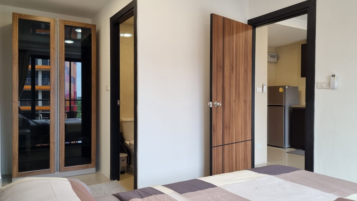 The renovate apartment with 32 Sqm, Medium in size at the 7th floor which building designed on small mountain. The place private and peaceful near Naiyang Beach 📍Highlight Area - Paronama View from the room - Walk 5 min to Bus stop station to the town - Drive 5 min, walk 15 min to Naiyang Beach & National Park - Drive 7 min, walk 30 min to Phuket International Airport #Free Wifi #Fully equipped for stay #Monthly Stay, Price exclude electrical & water charge, Free cleaning 1 time per week
