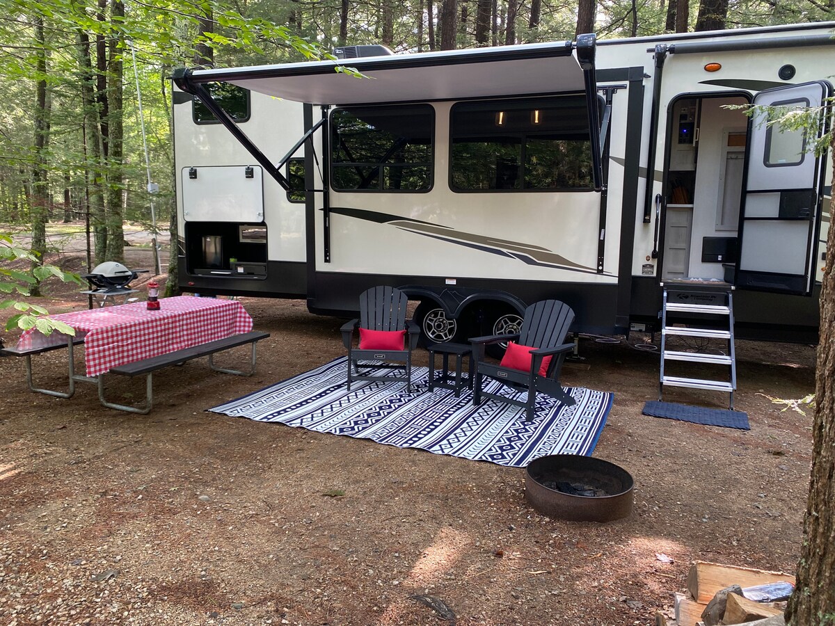 Enjoy the beautiful town of Wells in a completely renovated 25-ft camper on a private lot just 1.5 miles from Ogunquit Beach and walking distance from a trolley stop. Set on a secluded, fenced lot, relax outside on the deck, fire pit (FREE firewood), and plenty of lawn to run. It has a queen size bed, a reclining sleeper chair, and a fold down dinette for more guests or kids! It has AC and heat for comfort. This adorable RV has been thoughtfully modernized with all the comforts of home in mind!