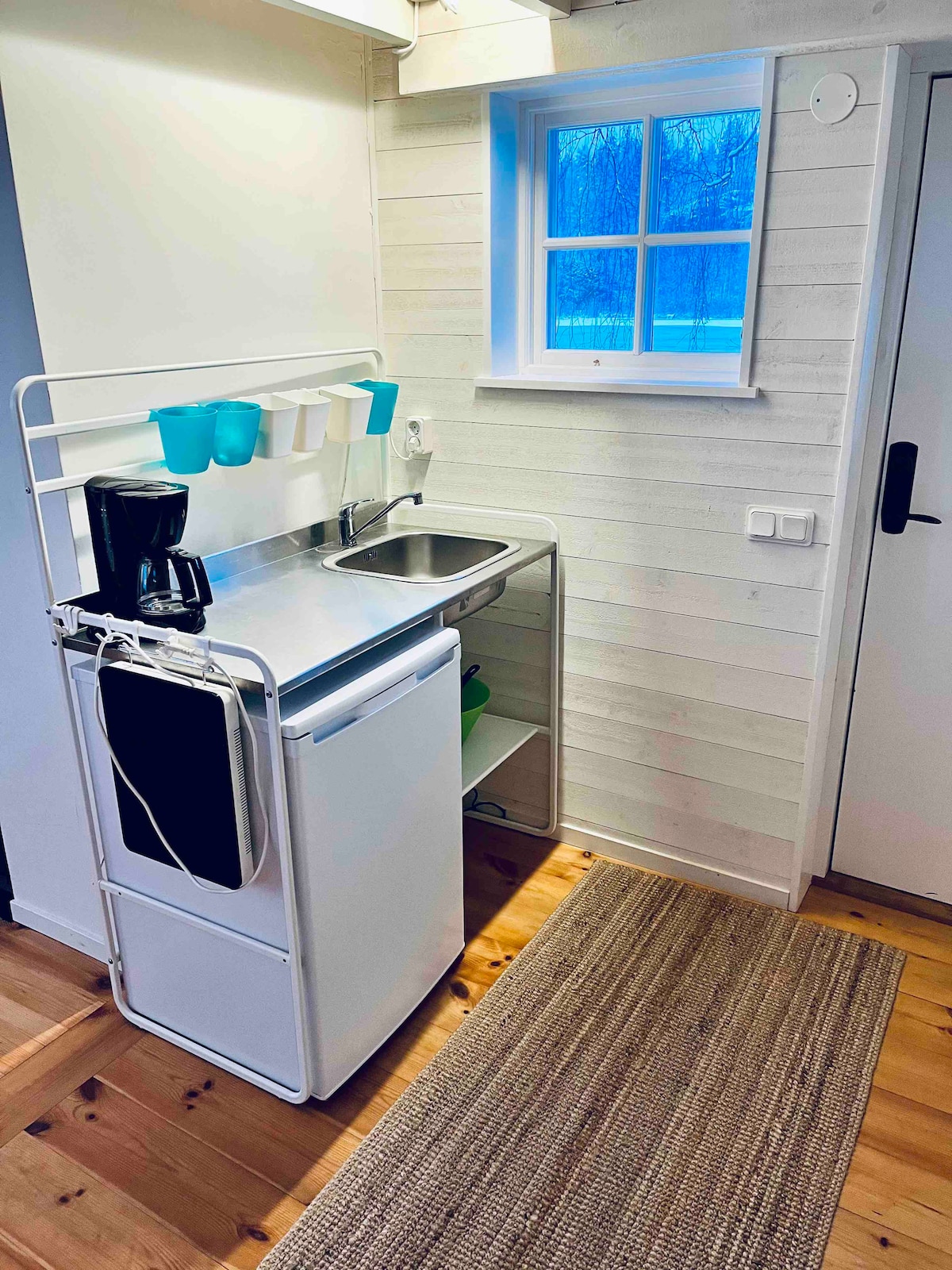 A relatively new (2021), air-conditioned cabin , located only 11Km from Eskilstuna, in a peaceful wooded area, a short walk from Sundbyholm's trotting track. The cabin is 30 square meters in area, plus a loft bedroom. Large bathroom with shower and washing machine, fully equipped kitchen incl dishwasher. The living-room offers a bed-sofa, 43" HD TV with ChromeCast, Netflix, etc, a PS3, and a selection of DVD films, Internet WiFi. A large wooden deck surrounds 3 sides of the cabin.