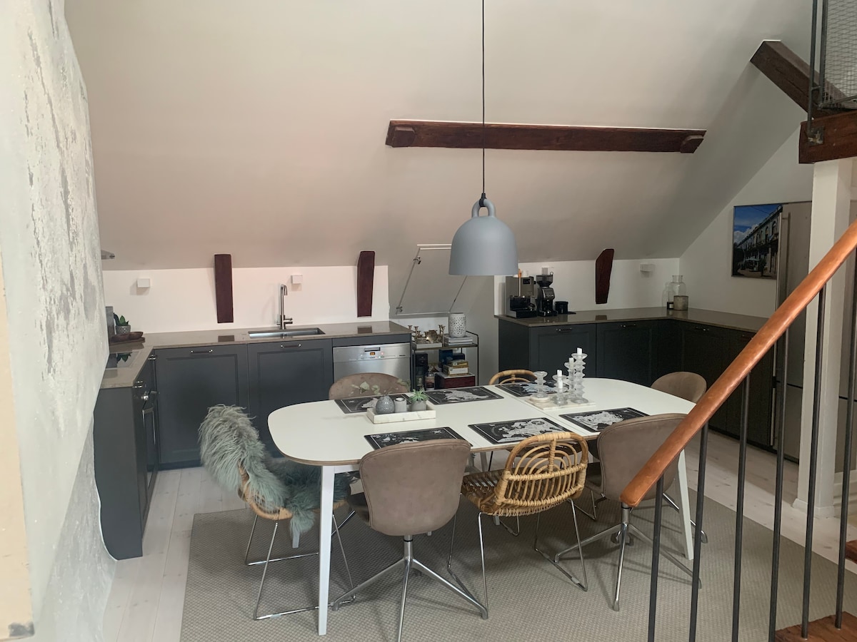Unique charming attic apartment of 120 sqm with 3.40 in ceiling height. 3 rooms and kitchen and with large balcony on the roof with outdoor furniture and gas grill. Outside, you have large, nice parks and playgrounds. Nice hiking trails and Fyrisån river just around the corner. Quiet and cozy area. A walk of about 15 minutes along the Fyrisån river takes you to the city center, or alternatively, you have 1 minute to the city buses. Parking for cars is available.