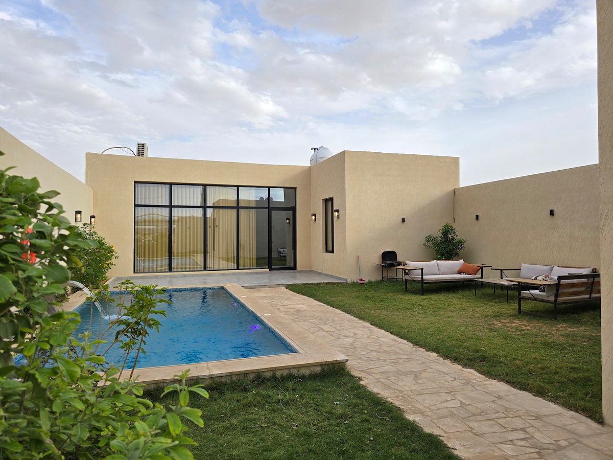Unique architectural designer chalet It is located near the north of the capital, Riyadh, away from the hustle and bustle of the city, so you can enjoy a quiet stay. It is characterized by the presence of a main majlis in addition to an additional majlis in the Arabic session, and a wonderful view of the sanctuary and the outdoor garden to guarantee you an unforgettable experience for your events and weddings.