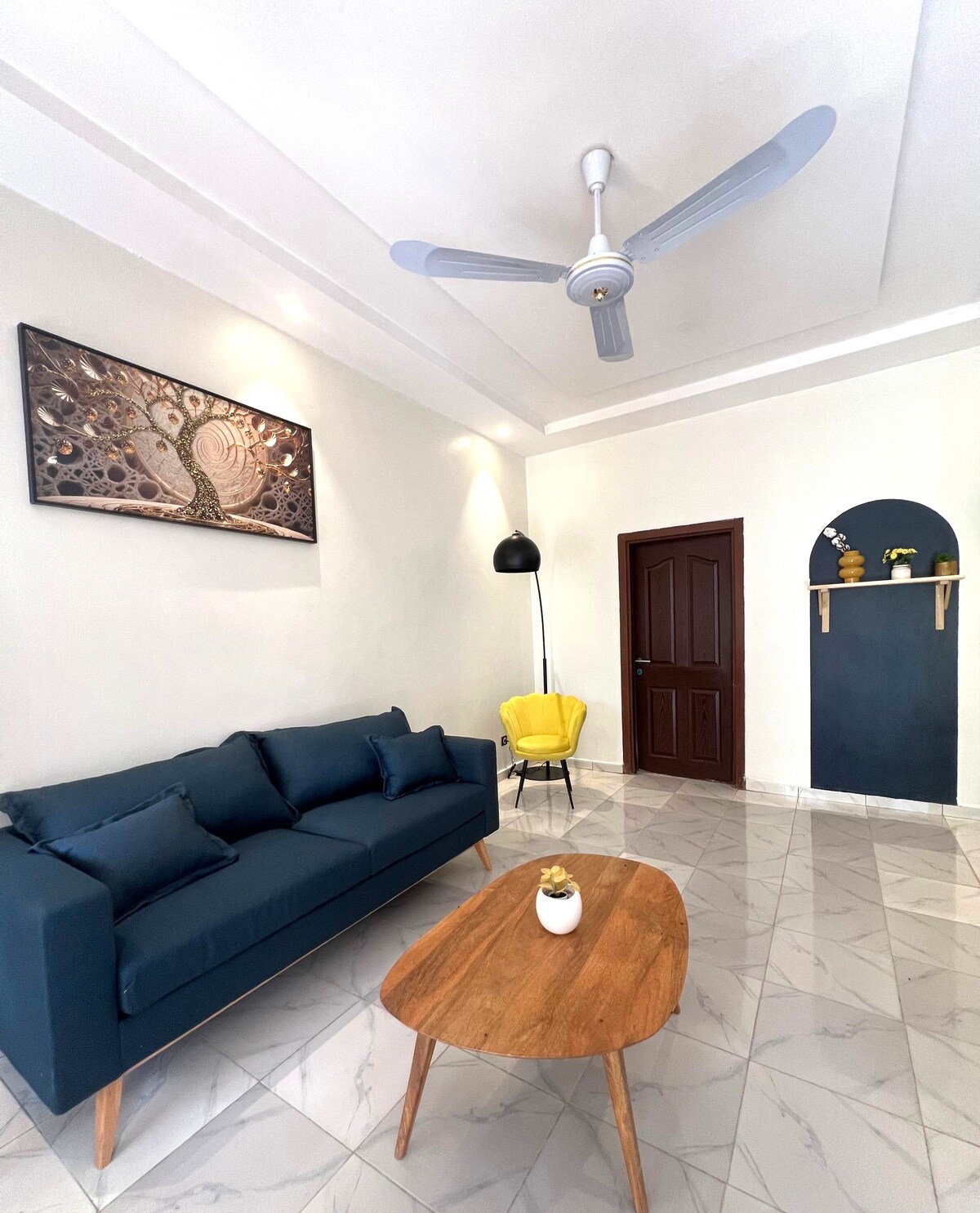 Relax in this quiet and stylish space, recently renovated in a white and black tone with flowers and designer paintings The apartment is conveniently located 1 km from the US Embassy, 50m from FEMAFOOT and 200m from the Ministry of Finance Electricity 24/7, the apartment has solar panels and a 15 kWh lithium battery to relay electricity load shedding. HOWEVER, The apartment is on the 3rd and top floor of a building with no elevator