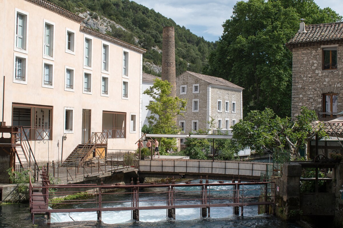 Apartment with unique view of the Sorgue from each room, whether you are inside or outside, the river surrounds you. Sit on the terrace, sit on the sofa and surrender to the flow of water. Located in a building classified as a historic monument, a 2-minute walk from the heart of the village of Fontaine-de-Vaucluse. The private residence consists of 30 apartments and opens onto a large wooded park and a small spring, private parking and a secure gate.