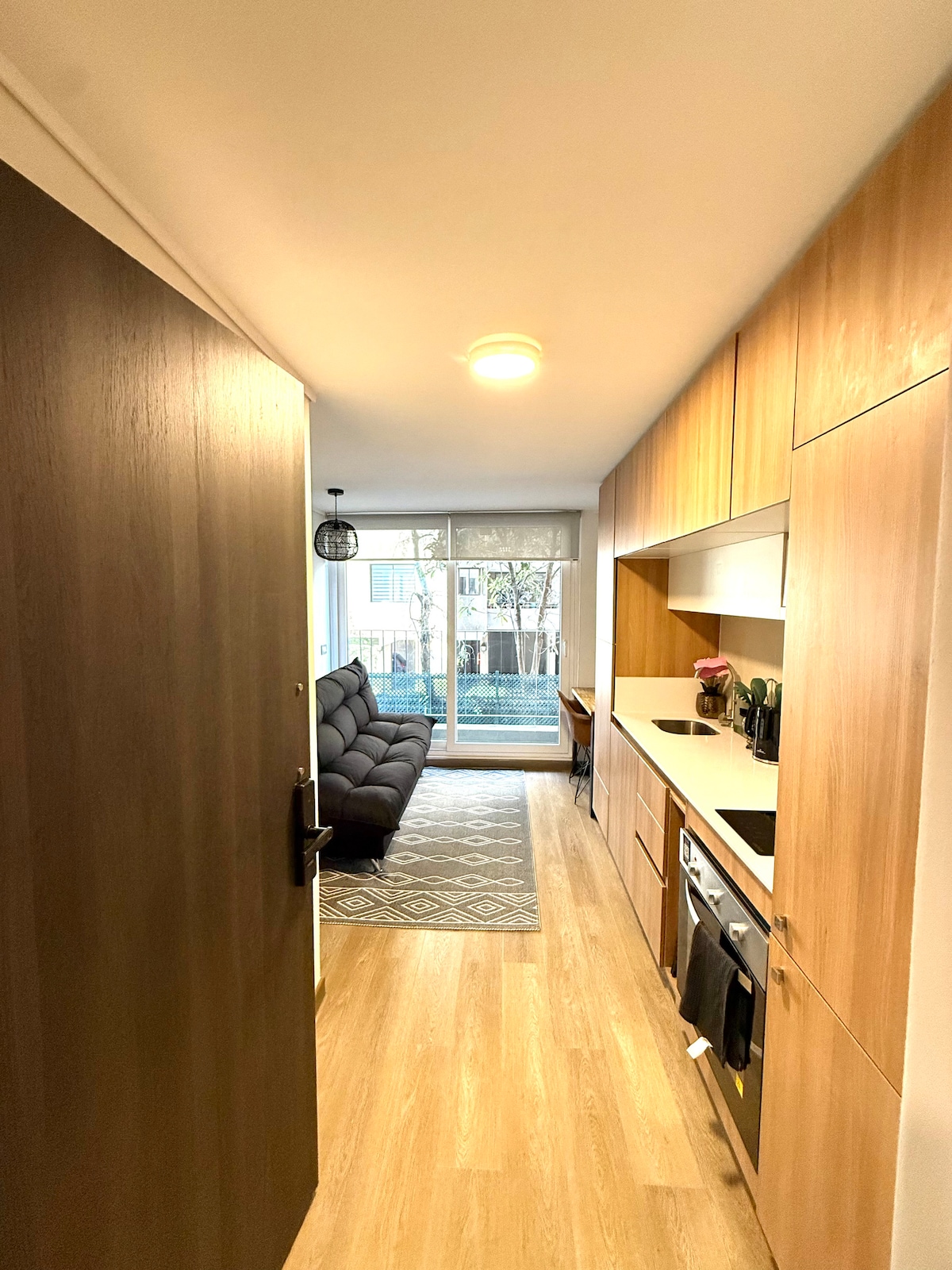 Launch Completely new studio, 2021 building, modern, 24-hour concierge. Located in the best area of Ñuñoa, you can walk to the subway and Mall Plaza Egaña (250 meters), a supermarket across the street, clinics, banks, restaurants, shops, cafes, and pharmacies. Parking in the building, gym, and laundry. Ideal for one or two people, all new, fully equipped kitchen and bathroom, ideal for long stays. Full-size bed, Wi-Fi, fiber optic TV, LG 50” TV, Netflix/DirectvGo