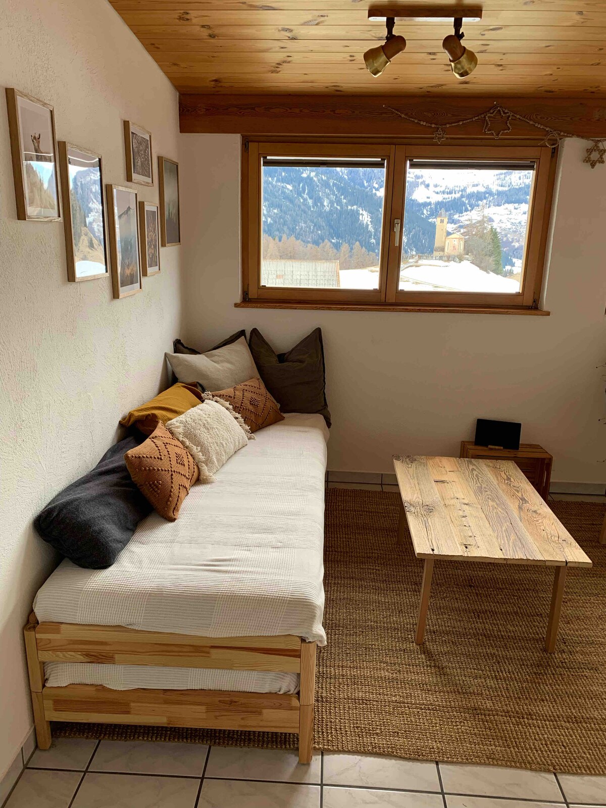 Cozy, simply furnished apartment in Cunter (near Savognin) with fantastic views of the mountains. Two bedrooms, living/dining area, kitchen and bathroom with tub. Ideal for those seeking peace and quiet, hikers, skiers (Savognin ski resort can be reached by bus or car in 5 minutes) or families who do not need luxury, but appreciate nature and relaxation. Parking space (including CEE plug 16a for electric vehicles) available. No Wi-Fi – perfect offline time-out! Pets welcome.