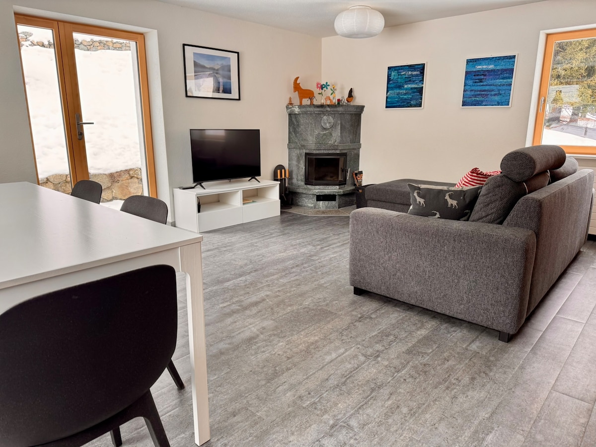 Allegra Kick back and relax in front of the fireplace... Lots of nature, the rushing of the mountain stream right next to the patio, wide plains and imposing mountains right outside the front door, with a wide network of hiking trails, cross-country trails and ski slopes. The train station is very close. The apartment was completely renovated and furnished with a lot of love for detail. Natural native woods, linen curtains, mineral colors and abrasions ensure a pleasant indoor climate.
