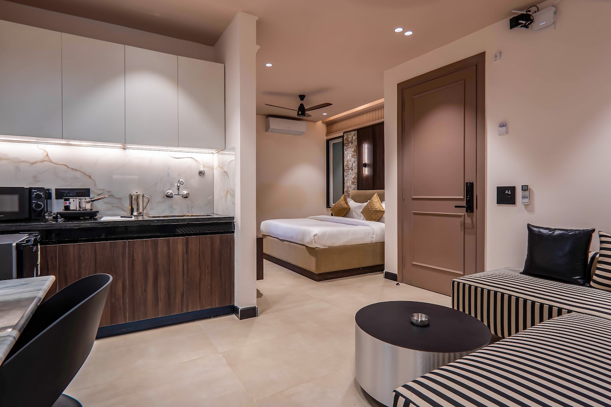 Indulge in the epitome of sophistication in this luxury studio apartment in the heart of South Delhi in Saket. Nestled in a prime location, Enjoy a tastefully furnished space, complete with luxurious decor and ample natural light. With a King Size Bed, Large screen 43" Smart TV, Fully functional pantry and a stylish washroom, every detail caters to a refined lifestyle. Immerse yourself in comfort & convenience. Welcome to a blend of luxury and urban living