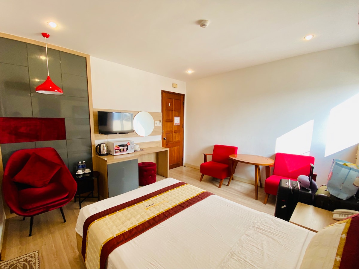 There is NO BREAKFAST in the room rate. We have breakfast service (A la carte) paid at hotel for you to choose if you want. Besides, there are restaurants or local food shops nearby or you can also order food online via Shopee food/Grabfood Rooms are 4-star equivalent with: - A king-size double bed (1m8 x 2.1m) with HIGH QUALITY LINEN. - FREE room cleaning everyday NOTICE: Because the hotel is nearly some local restaurants so it can be noisy sometimes if the restaurant has a party.