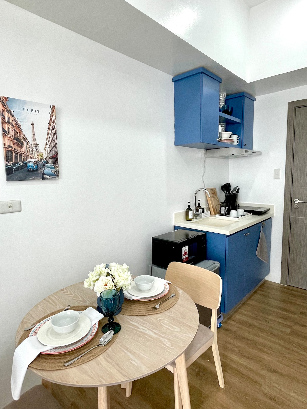 Welcome to our chic Parisian-inspired studio type condo, where elegance meets modern comfort. This stylish unit boasts of tasteful decor, reminiscent of the timeless charm of the city. Enjoy the view of the the pool from our mini patio where you can sip your coffee in the morning while watching the sunrise. Unwind, Netflix & chill in the cozy living space adorned with contemporary furnishings. Conveniently located since it’s just a 2 min. walk to Ateneo de Cebu & a 30 min. drive to the airport.
