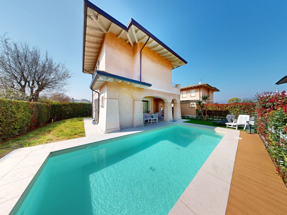 New and modern 65 sqm single villa surrounded by a spacious garden with magnificent panoramic views of Lake Garda. Guests have access to a 4*8m infinity pool overlooking the lake, ready from May 2025, a barbecue for fabulous grilling and a garage. The master bedroom overlooks the lake-view garden. It is located in a hilly position and is recommended for those seeking tranquility amidst the green of olive trees and a stunning lake view just a few steps from Bardolino.