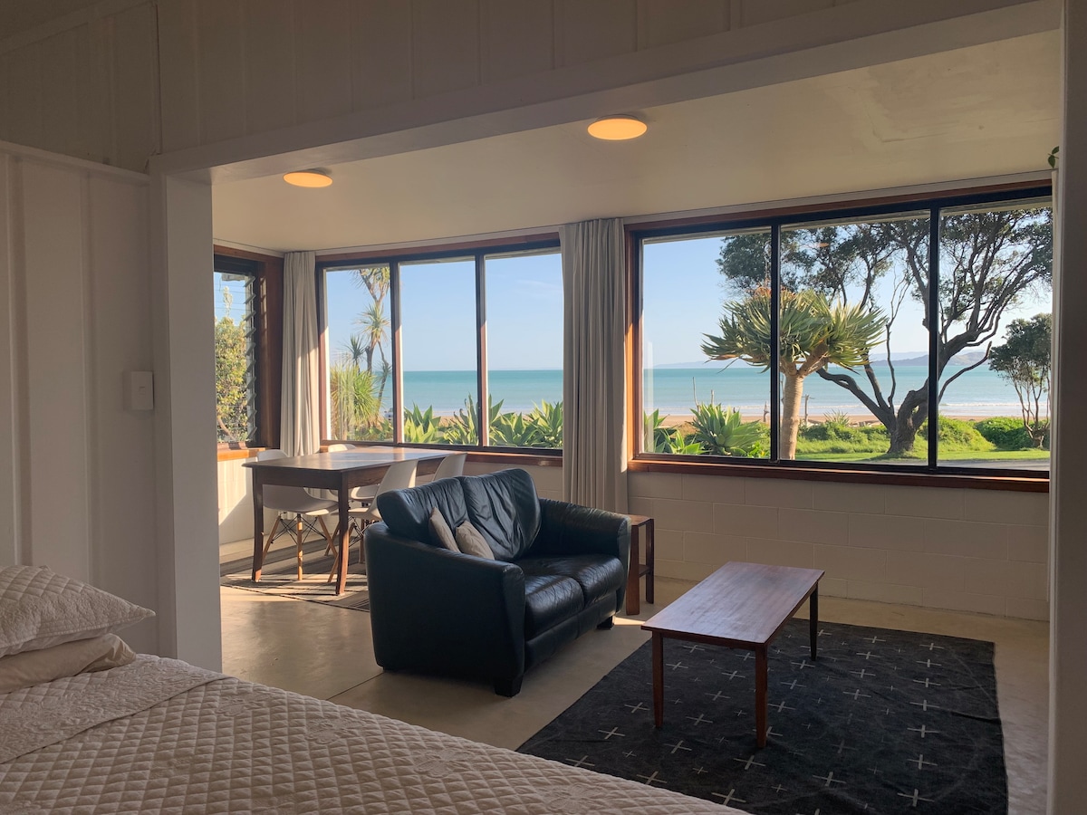 Beach front bach on Wainui Beach. Fantastic views whatever the weather, stunning surf beach, the bach overlooks it all. Wow factor sun rises, keep the curtains open and have a treat! The cottage has a queen bed in an annex in the main area so you can wake up to the view, or watch the waves at night under the moon. There are bunks in the bedroom, a heat pump for toastie winters, this place is a rustic humble piece of kiwiana beachlife, a total rejuvination space and a surfers heaven.