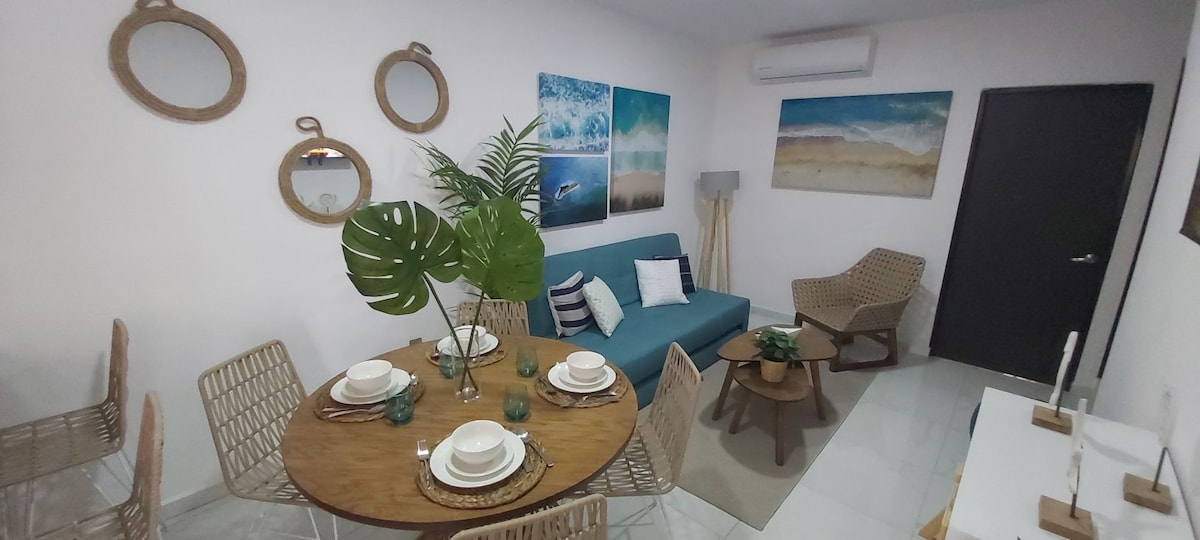 Beautiful apartment recently remodeled, equipped Pet-friendly, air conditioning in all areas, swimming pool and wading pool, on the 2nd floor you have to climb stairs, entrance to the beach across the Av., bathrooms and another pool with ocean views, Wi-Fi, cable TV. Located a few steps from the sea on the main avenue Miguel Aleman, in the hotel zone, very close to the area of restaurants, bars, clubs, shopping center and shops to stock up. Entrance with electronic lock, and parking.