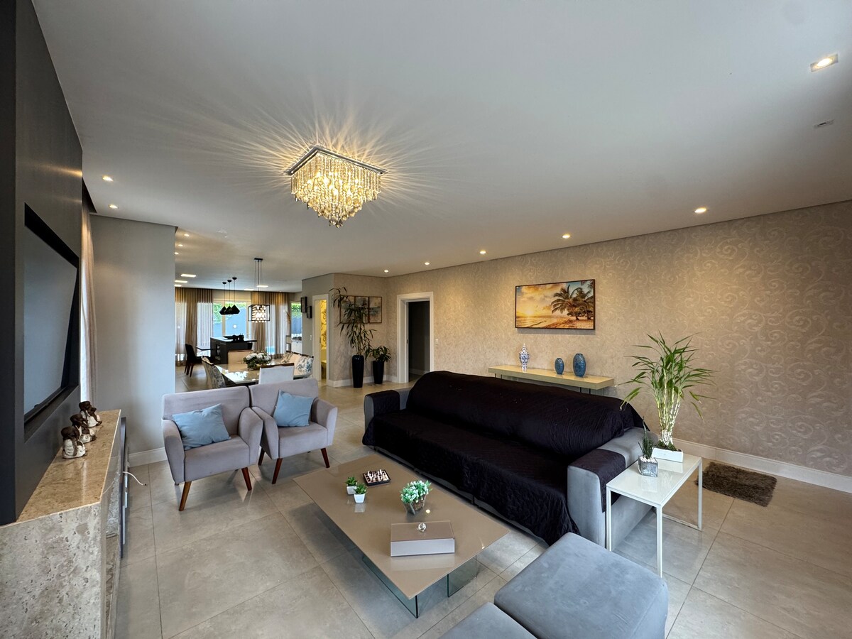Please read the HOUSE RULES before booking. You will agree to abide by them when booking. House with 3 bedrooms, 1 queen-size bed suite, 1 double bedroom and 1 maid's room with a double bed. Air-conditioning in all rooms. Swimming pool with solar heating, Wi-Fi, pool table, outdoor and indoor barbecue, oven, microwave, etc. The house accommodates up to 8 people, including the living room sofa. Address: Atlântida-Cidade Xangri-la Neighborhood
