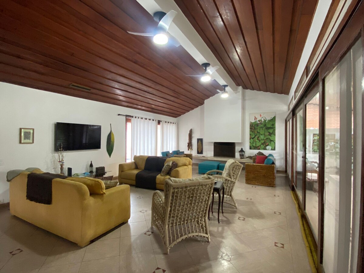 Enjoy incredible days in this beautiful, spacious and super comfortable house, located just 3 minutes from Pernambuco Beach, one of the most beautiful in Guarujá🌊☀️. • Gourmet area with barbecue • High-speed Wi-Fi • Free Massage Chair • Cozy indoor fireplace There are 4 bedrooms (2 en-suites), 3 bathrooms, a dining room, a living room, a 100% equipped kitchen and 4 parking spaces.