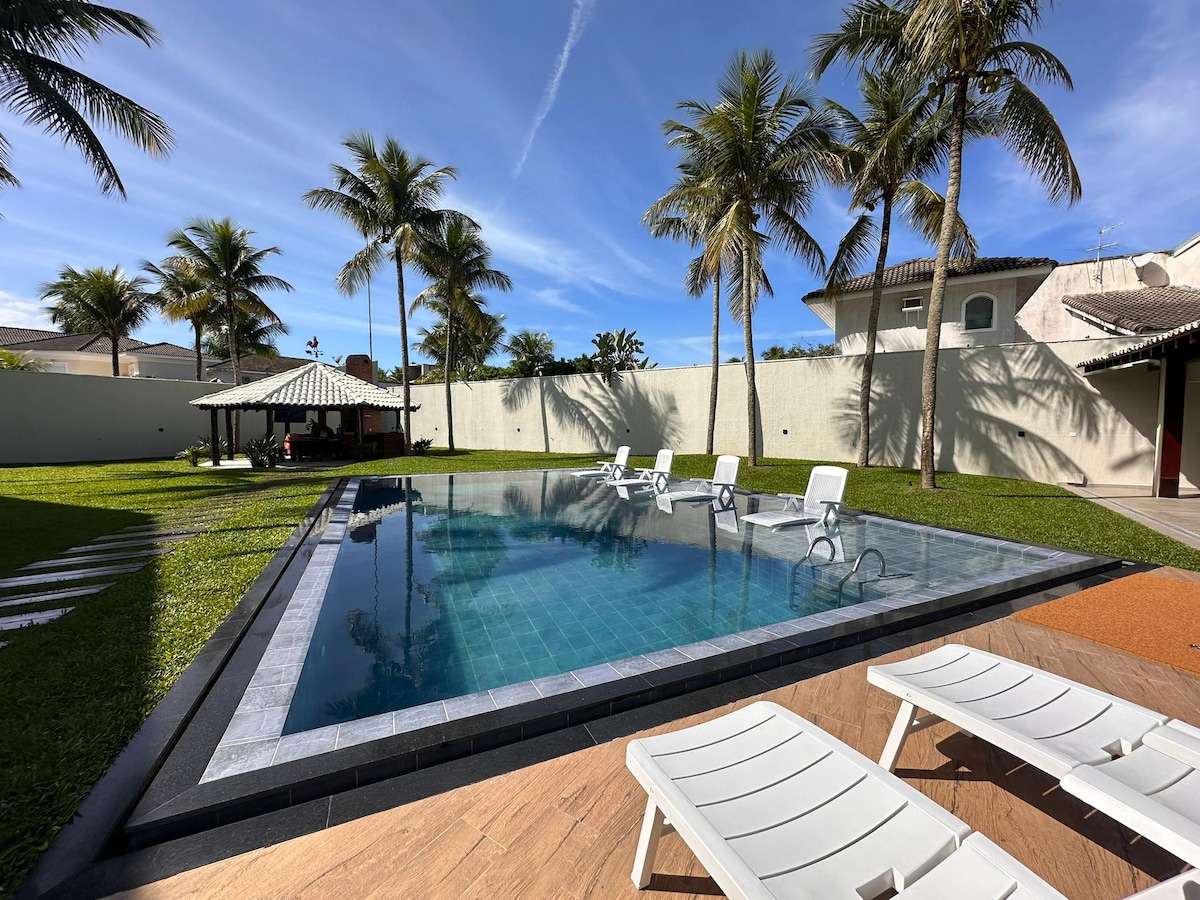 Excellent property one block from the beach near Sofitel Jequitimar, Pão de Açúcar, bakeries, pharmacy and other shops. Newly built, modern, comfortable with air-conditioning in the living room, kitchen and bedrooms, it has Wi-Fi and a large outdoor leisure area with heated pool (solar heating) and whirlpool, a barbecue area with a pizza oven and wood-burning stove, a pool table and ping pong, a dining area, perfect for days of rest with family or in the company of friends.