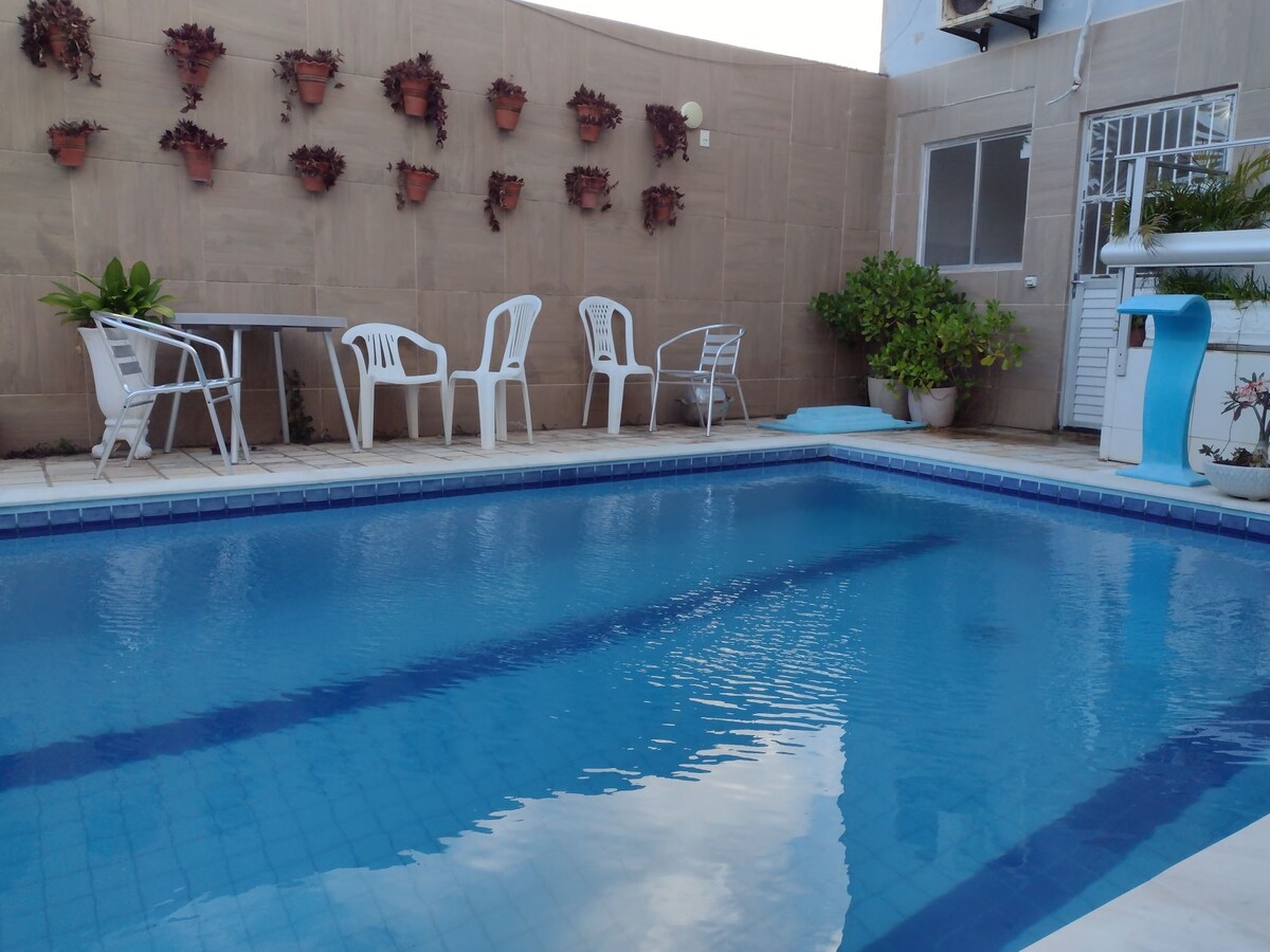 Flat on the third floor, with a suite, living room with American kitchen. It is 400 meters from the beach, in the heart of Maragogi, a few steps from a bakery, supermarket, restaurant, pharmacy, 24-hour ATM. The parking lot (public) is in the square in front of the flat...
