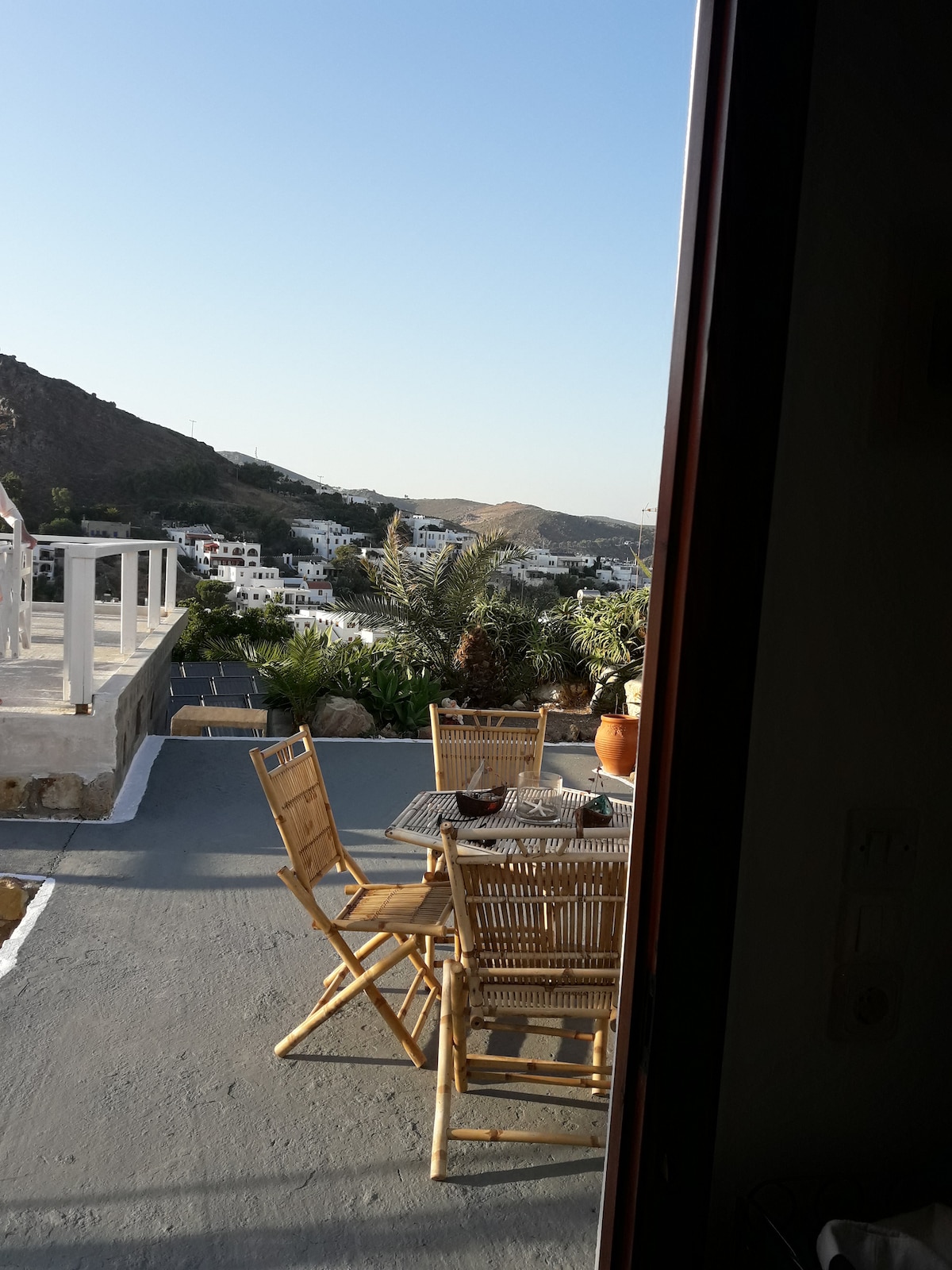 Unique studio 1 , breathtaking 360° view. Cute and traditional, 25m2, 2-3 guests (1 double, 1 single bed ) kitchen corner, bathroom, wardrobe, A/C, ceiling ventilator. Priv. sea view terrace 20m2, solarium. At the top of a 60m high hill next to Skala, you’ll find our exceptional property with studio 1, quiet, surrounded by gardens. Panoramic view over Skala, the bay and Monastery. Just a 7 minutes walk to the beach, the marina, restaurants, supermarket and shops. Free parking in the property.