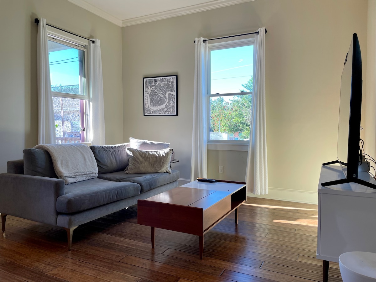 Experience a touch of history in our grand Italianate Brackett apartment, dating back to 1872. With its stunning floor-to-ceiling windows and 12-foot ceilings, this beautifully renovated 150-year-old double offers a blend of historic charm and modern comfort. Located in a quaint city just 10 minutes from downtown New Orleans. Explore local shops, bakeries, restaurants, coffee houses, bars, and the picturesque riverfront all within walking distance. Perfect for a unique and memorable stay!