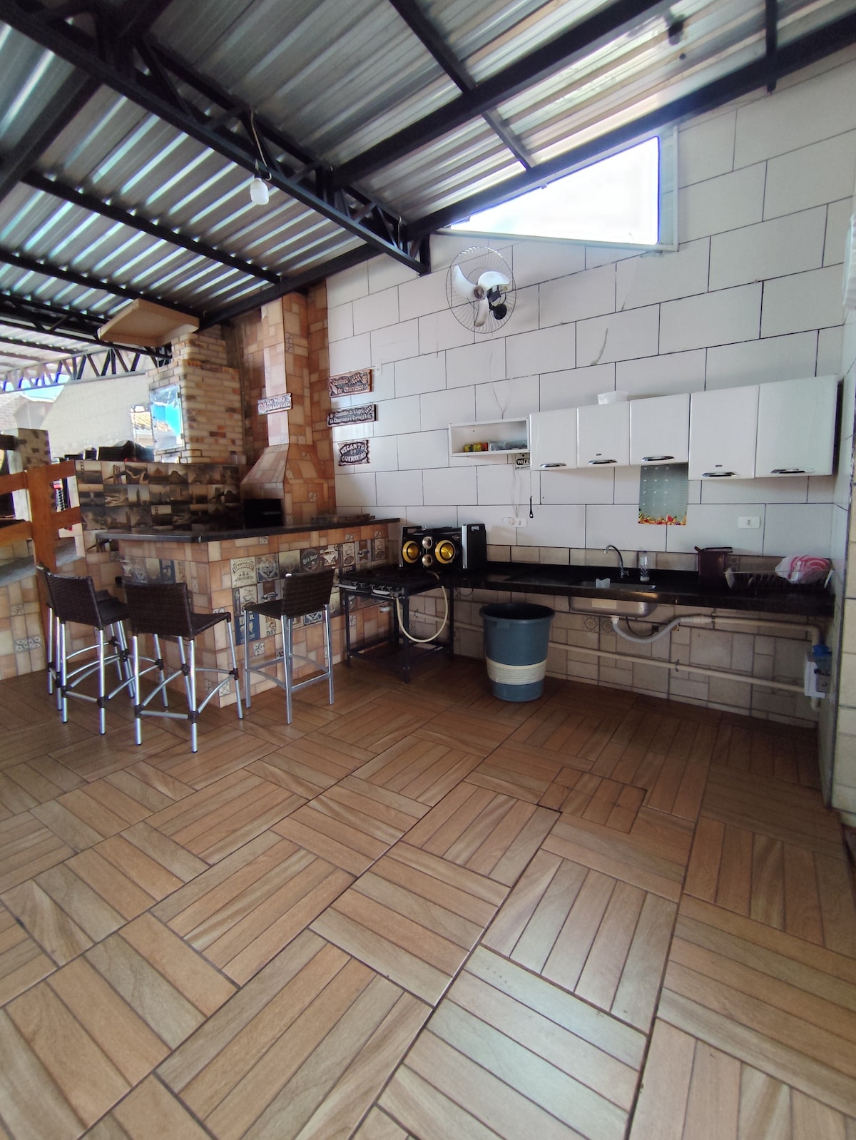 This beautiful house is perfect for group travel. A suitable place to stay and enjoy this wonderful pool and large, air-conditioned Gourmet area. Charcoal barbecue, marble countertop with stools, a beautiful wooden table. Full kitchen. • 3 Suites • 1 bedroom • TV room • Air-conditioned dining area • Kitchen utensils • 6 Stools • Pool • 3 Sun loungers • 4 Area Chairs • Plastic tables available • Stairs with handrails to access the Suites.