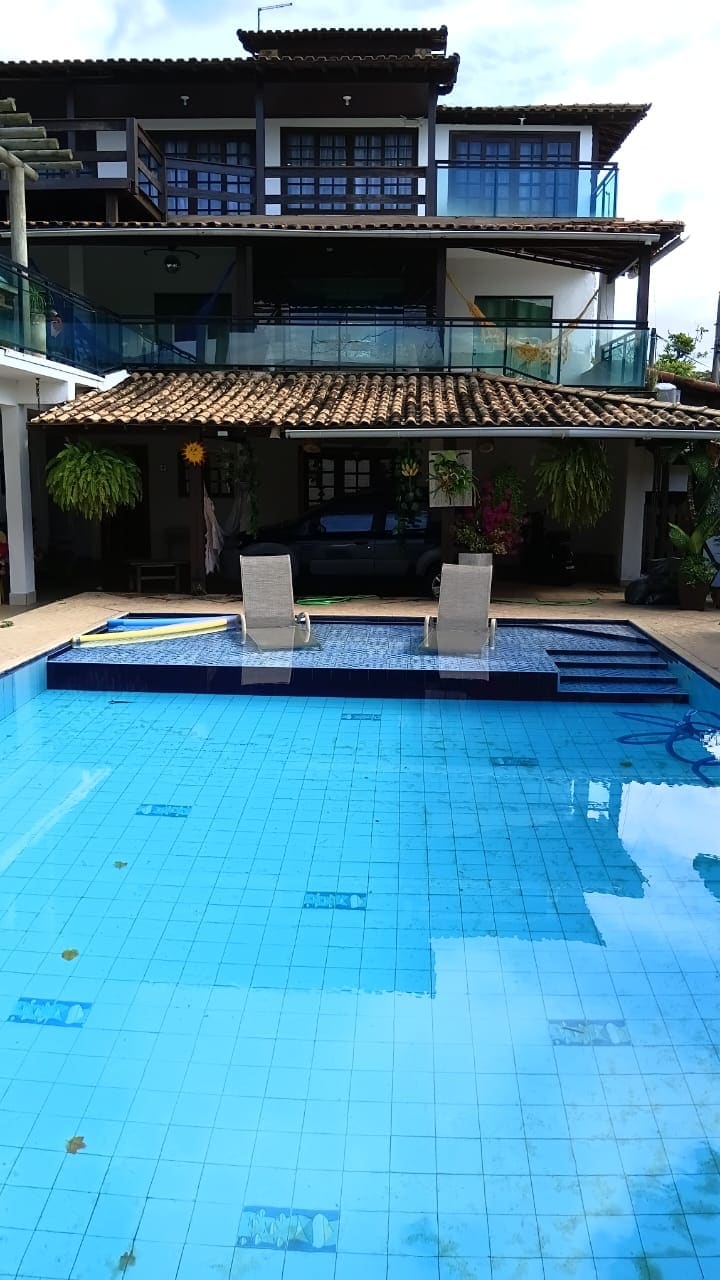 House with swimming pool, barbecue, pool, darts, ping-pong, Wi-Fi and view of Lagoa de Jacaroá, 5 minutes from downtown Maricá (paved access). Located on a plateau, the house has 2 floors. The upper (main) floor has 4 bedrooms, 1 suite and 1 dependency, 2 bathrooms, a large living room with a balcony and an equipped kitchen. The lower floor has a bedroom, kitchen, bathroom and a large game room with a balcony.