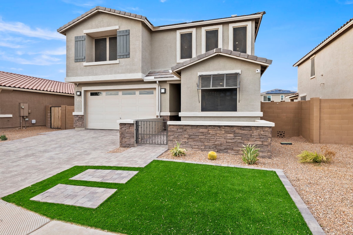 Spacious home with a large master bedroom and king bed. 9 ft ceilings throughout. Enjoy two 85” TVs, two 75” TVs, board games, kids’ toys, and two rooms with pull-out couch beds. Next to a beautiful park and fountains. Located at the entrance of Maricopa for quick Valley access, with many nearby shops and stores. Enjoy your stay, we look forward to hosting you! Disclaimer: Max 10 guests, no gatherings over 10. Exterior security cameras are on-site for guest and host safety.